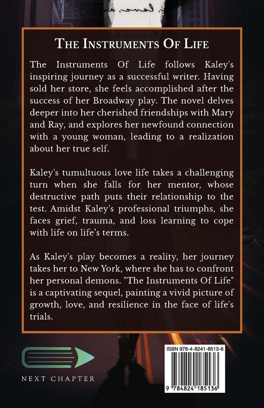 The Instruments Of Life follows Kaley's inspiring journey as a successful writer. Having sold her store, she feels accomplished after the success of her Broadway play. The novel delves deeper into her cherished friendships with Mary and Ray, and explores her newfound connection with a young woman, leading to a realization about her true self. Kaley's tumultuous love life takes a challenging turn when she falls for her mentor, whose destructive path puts their relationship to the test. Amidst Kaley's professional triumphs, she faces grief, trauma, and loss learning to cope with life on life's terms. As Kaley's play becomes a reality, her journey takes her to New York, where she has to confront her personal demons. "The Instruments Of Life" is a captivating sequel, painting a vivid picture of growth, love, and resilience in the face of life's trials.