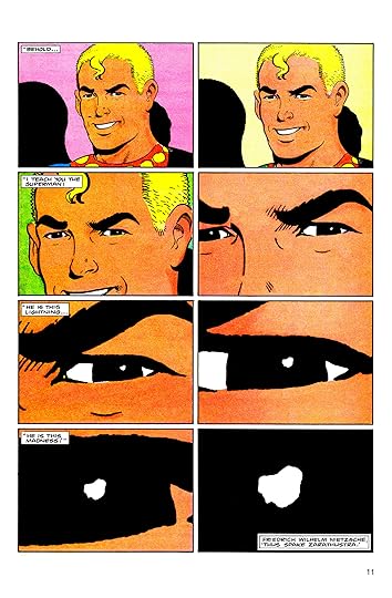 A god shall walk among men, thus spake Zarathustra; this one walks from the technicolor innocence of the comic book 1950s into the dark and grime of the real world 1980s. A meta commentary on that ridiculous, wonderful innocence, an homage and a critique as well. A boy-hero transforms into a bloodthirsty villain; a teen-hero transforms into a schlubby everyman. A schlubby everyman becomes a living god; a happy dream of flying is suddenly remembered!