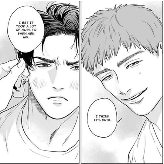 The way I'm giggling and kicking my little feet. This was so cute! I really liked the development of their relationship and the intimate scenes were so good. The art is a little inconsistent in their faces, but the style is beautiful. I loved looking at it. I'm a little bothered that Junta is a high school student. It's such an unnecessary detail, but they don't play into it much so it's easy to overlook. I just love the trope of big scary guy who's actually just shy and awkward with his golden retriever boyfriend who only sees him as adorable. So good.