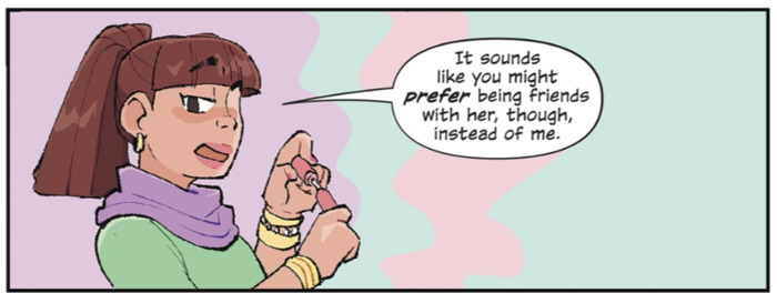 These graphic novels hew pretty closely to the originals, which means that Jessica and the Unicorns are just awful. Their bullying of Nora is intense and constant—they mock her relative poverty, steal her gym clothes, lie to teachers to get her in trouble, threaten to frame her for theft, and on and on it goes. And Nora, meanwhile, is so desperate for a bit of kindness that she's ready to forgive and forget the second the Unicorns offer a tiny crumb of kindness...and that she doesn't stop to consider whether that kindness is genuine or lasting.