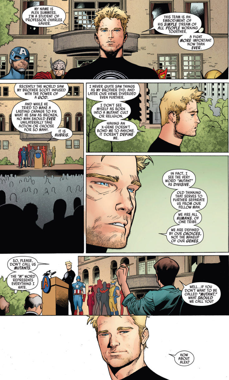 >>> Alex Summers finally taking on a leadership role and butting heads with Kapitan. His speech about distancing himself from the label 'mutant' was intriguing and Bendis in All-New X-Men was given a chance to respond to it through Kitty Pryde's insight. Comparing their opinions about the subject matter was genius. I like how they both have valid reasons for their convictions; Alex wanting to be treated as more than just his identification as mutant; and Kitty claiming that distancing yourself from your race only contributes to the discrimination and prejudice itself. On some days, I'd lean on Kitty because it seems more realistic to think of the world in terms like that and to fight against any form of oppression by stating that "I am _____ and proud of it". But, on other days, I think I also aspire to live in a world that Alex is preaching where divisions of race, gender, sexual orientation don't ultimately matter.