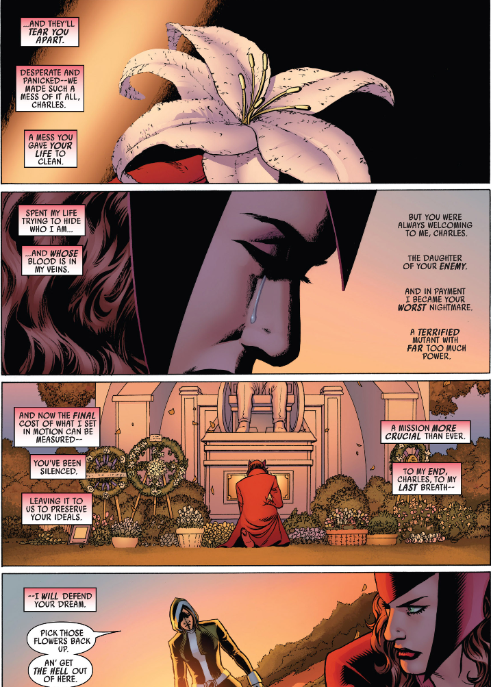 My favorite part of this, which we all can probably figure out, is Scarlet Witch. Not only is she a kick ass hero, but her powers are virtually unparalleled in this volume. Her devotion to Xavier and his longing for peace in the world are her driving force in realizing how polluted Red Skull is. And her scenes with Rogue while they mourn Charles are incredibly powerful.