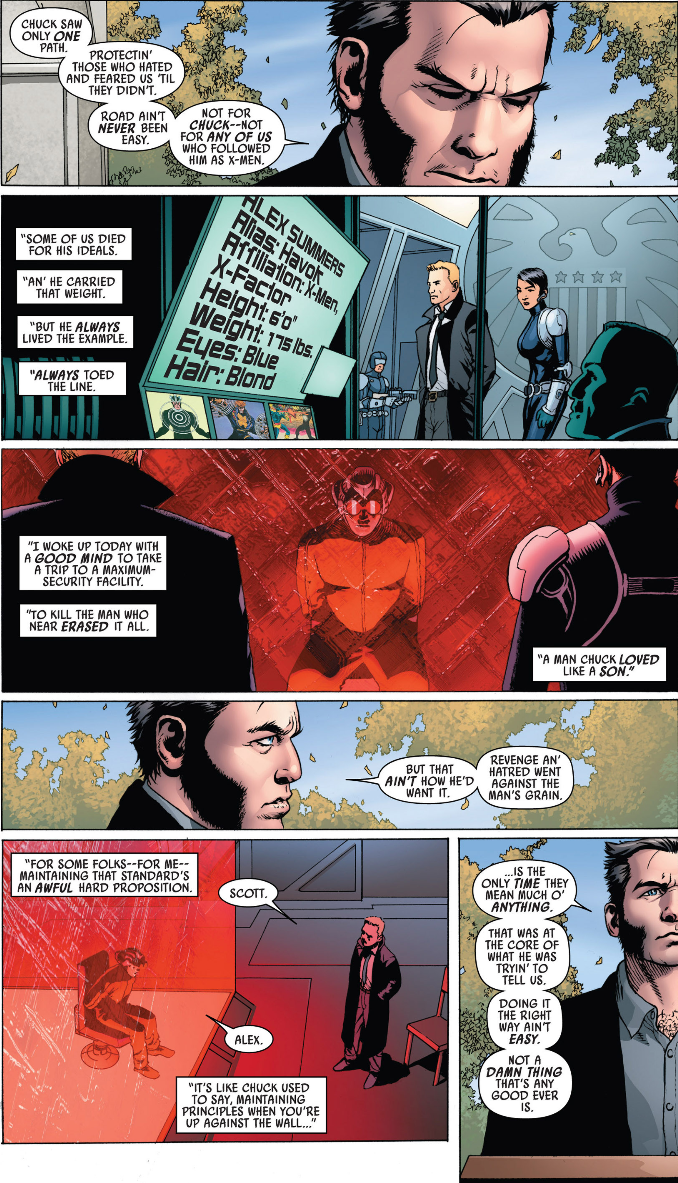 Nothing about this was really spectacular? As usual, a few characters don't speak like normal human beings? There's a balance to writing in superhero speeches and writing in too many superheroisms into every day speech. A few times here, I felt as though Cap and Havok didn't talk like a human being.