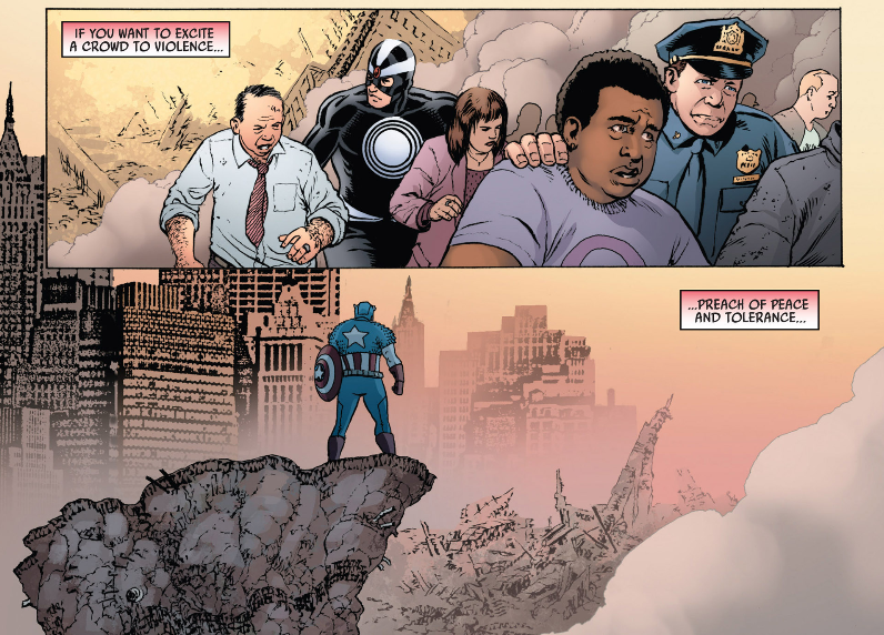 It's gimmicky--it's blatant publicity--it's a desperate measure of compromise to appease the general public regarding the mutant threat. It's everything experimental that would make me anxious for the most justifiable of reasons. It only took him decades, but hey, at least Captain America was now willing to stand up for the mutants and include them in his agenda for social change and upholding the American values. Look, I've been a fan of Kapitan in the movies, but based on the ways he was characterized here in Remender's title and the AVX issues--I'm not sure I buy his brand of noble superhero. For one thing--did it really have to take him this long to take a stance promoting mutant rights? But should is still surprise me at this point? No race and minority has been oppressed this much in comics than the X-Men. It's essentially the encompassing themes of all their stories.