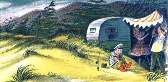 Ty and his parents had just arrived at their usual camping spot, where, while Ty pulls on his bright red wading boots, the grown-ups contend with the trailer and awning. “Each year they came to this same wind-swept beach for their summer vacation.”