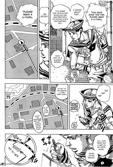 I have to stop comparing this part to Steel Ball Run and be patient, even though the enemy encounters feel less attached to the plot than in Part 7. It's a totally separate part and I need to treat it as such