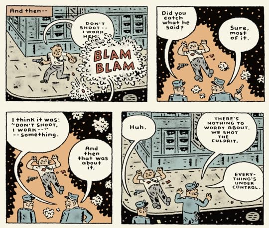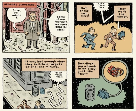 There is much to like about this book though. The art style reflected the immature approach that the FLQ took to glorious revolution. The format of a cancelled CBC documentary was an intelligent and appropriate way to structure the narrative. There's one sequence of panels near the end that were exceptionally well constructed--the ones that detail the botched bombing that killed 17 year old Jean Corbo. The build-up shows how FLQ leadership sought idealistic teenagers to do the dangerous dirty work for them while they hid in the wings. Rather than showing the bombing being carried out, as he had before, Oliveros depicts the whole affair from the co-conspirator's perspective, showing him realizing that the bomb went off prematurely, fleeing the scene to warn the rest of the FLQ at their compound, frantically seeking updates from the news, and finally, in the finest panel of the whole book, hearing from the radio a graphic description of what happened to Jean Corbo when the bomb exploded. There is substantial emotional weight to this scene, as other members of the FLQ realize that they sent a teenager to his death--horrific, regardless of how competent and self-possessed he seemed.