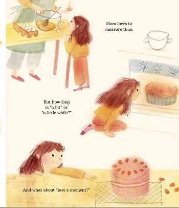 They are running to school, almost at the gate, and Mom wishes time would slow down. Guess who doesn’t? School goes forever, it's boring tagging along after Mom at the veggie market, and how long do you have to wait for Mom to mix the cake and bake it? “Mom loves to measure time. But how long is ‘a bit’ or ‘a little while?’ And what about ‘just a moment?’”