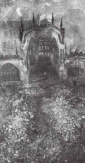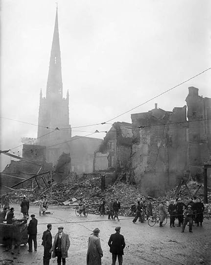 From the cathedral roof Harriet can clearly see the neighbouring spires of Christ Church and Holy Trinity Church. She can see the dark hunch of roofs and the rivering streets between them, but after that the buildings fall off into shadow. The fire appears as a small orange smudge in the distance. It seems so far away that Harriet feels more relief than worry at first, until she remembers that most of the large factories in Coventry are on the outskirts of the city, right where the fire begins to bloom across the horizon line.