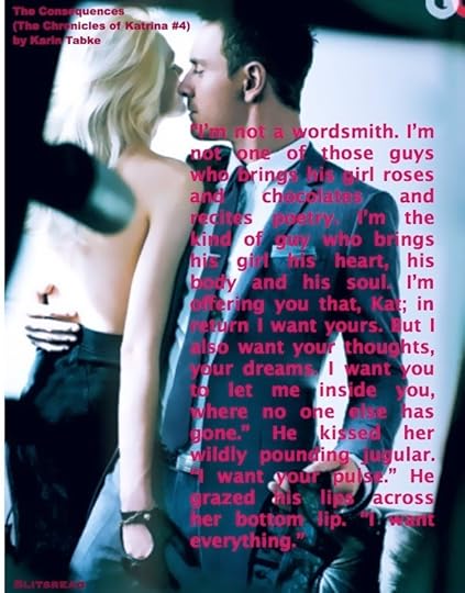 Hot, explosive, suspenseful, romantic story is a highly recommended read The Consequences by Karin Tabke. Katrina and Simon are interrupted by Amanda, Simon's sister-in-law, who wants Katrina out of her house because Simon belongs to her. Katrina hears Amanda tell Simon that once Katrina knows the truth about Simon, Katrina will be gone. Katrina gives Simon an ultimatum to Amanda which surprisingly Simon gets Amanda to leave. As Katrina and Simon's love and attraction grows for each other with explosive, hot scenes, Amanda strives to come between them. Meanwhile, Katrina wants to get evidence against her co-worker and ex lover, Evan, who got her fired from her job and research. Will Amanda come between Simon and Katrina? Will Simon and Katrina have a happily ever after? Will Katrina prove Evan as the culprit? Read the highly, romantic conclusion The Consequences (The Chronicles of Katrina, #4) by Karin Tabke.