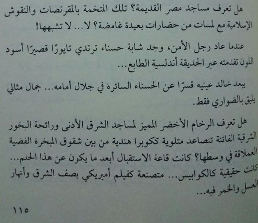 فيه حتّة كده لا أجد لها مبرر في قلب النص الحواري ص115 : هل تعرف مساجد مصر القديمة ؟ تلك المنحتة بالمقرنصات و النقوش الإسلامية مع لمسات من حضارات بعيدة غامضة ؟ ..... لا .. لا تشبهها ! أنا : ايه لازمته الجو ده يعني ؟! لاااا ده احنا جايين نهزّر بقى !