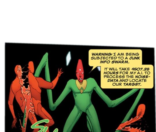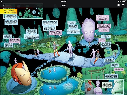 Then we get back to the actual story. In the first volume, I liked the debate over A.I. personhood. A number of artificial intelligences have been a part of the Avengers or other superhero teams. I would love to see this concept explored more. What I did not like in the first volume was the Diamond, the virtual world of the A.I.s. A 100% A.I. driven world would not need visual reference, A.I.s would not need bodies and streets. They wouldn't create the Sprawl, the Matrix or the Oasis. That's all for human reference.
