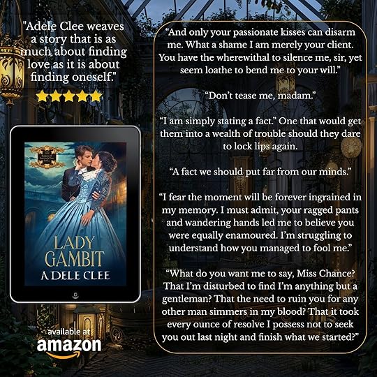 I absolutely adored Lady Gambit by Adele Clee. It was so very well written, that I felt as though I was standing in a shadowed corner watching as each gripping scene played out. Ms. Clee's balanced style easily moved me from one vantage point to the next, while all the while keeping me guessing just when the villain would strike.