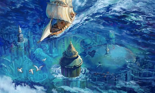 The city of Celestrus was a collection of massive needle-like structures—gold and silver and transparent—that hovered in the middle of the dark blue water in a spiral, like a necklace around a floating woman’s throat, the points stretching down into the darkness below. Above the highest spindles of the city, sunlight danced in the water, making patterns atop of the city that flashed and glittered.