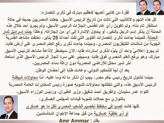 كتاب مستفز جدا، يحكم على ثورة ٢٥ يناير بالمؤامرة المخطط لها من الإدارة الأمريكية و عدة منظمات تابعة لها، طب ماذا عن الشعوب المقهورة التي نادت بنظام قمعي عاشت معه ٣٠ عام من الإعتقالات و الإختفاءات القسرية و الفقر. متحامل جدا علي الإخوان المسلمين، مع اني لست منهم و لا حتي اتعاطف معهم و لكن اعتقد انهم ليسوا بهذة الشيطانية التي تروج في وسائل الإعلام، و لماذا لم تحمل الشرطة المصرية اللوم و المسؤولية بقدر ما يحمل الإخوان فقط؟ و يسوق لكلام غير مقنع، مثلا الكلام عن ان شفيق هو اللي كان فائز بالرئاسة، و تغلغل الإخوان في الدولة في ظل حكم المجلس العسكري ضغط لفوز مرسي، اي كلام فاضي بجد، يا راجل دة بيهول لتحكم الإخوان في الإدارة الأمريكية، لية يا عم هو سوبر مان!!!. قرأت للفصل ١٦ و مرارتي لم تحتمل اكمل قراءة اكثر من ٨٠٪ من الكتاب، الله يحازي بقي اللي نصحني اقرؤة.