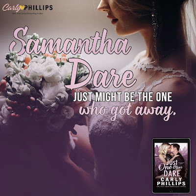 Just One More Dare is the newest release in the Sterling Family series, which brings back Samantha Dare, from the original Dare Family series. Dex Sterling is at the right place at the right time to help Samantha get away from her wedding after she discovers her fiancé has been cheating on her with his assistant.