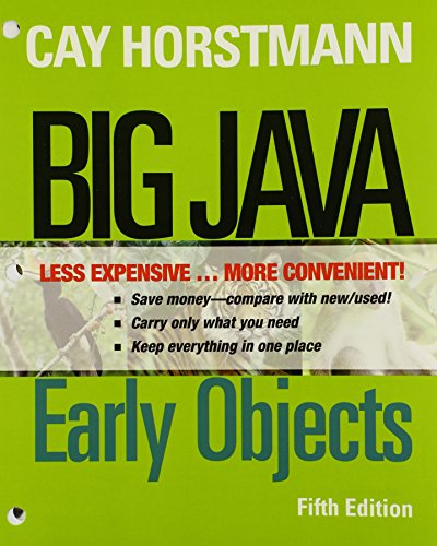 This text is an unbound, binder-ready edition. Cay Horstmanns fifth edition of Big Java, Early Objectsprovides a comprehensive and approachable introduction to fundamental programming techniques and design skills, and helps students master basic concepts and become competent coders. The inclusion of advanced chapters makes the text suitable for a 2 or 3-term sequence, or as a comprehensive reference to programming in Java. Major rewrites and an updated visual design make this student-friendly text even more engaging. Filled with realistic programming examples, a great quantity and variety of homework assignments, and lab exercises that build student problem-solving abilities, it is no wonder Big Java, Early Objectsis the number one text for early objects in the Java market.