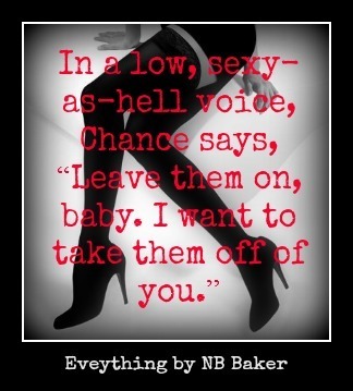 I want to thank Goodreads and the Author N.B. Baker for a copy of this wonderful book!!!!!!! I loved the characters!!!! I loved the story!!!!!!!!!! I want Chance!!!!! This book was so intense, and I couldn't put it down...only I had to for a few days and couldn't wait to get back in or I would have read it in one sitting! I loved how the story flowed and you got to know the characters without all the 2 pages of back ground history. The intense feelings between the two characters was fun, exhilarating and the hint that something was going on with Chase's character was a climax to the end, but not as climatic as the love scenes!!! I will definitley read N.B. Baker's next books! Good Job Girl!!!!!!!!!!