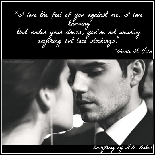 N.B Baker had me cussin at her within 3% into the book!!! In a good way of course!! Awesome Debut! I was introduced to Everything by N.B Baker at an event and i was so enthralled with the teasers and description of this book i knew i HAD to have it and read!! Chance Chance Chance!! I fell in love with him at 'STARFRUIT' Ella has had a rough life with feeling loved and wanted due to her parents giving her up when she was born. Her Grandparents showered her with love and showed her how it feels. She thought she in a loving relationship but there wasn't a 'ZING' there, but what she thought was a decent life turned into more disappointment. Chance is battling his own dark demons and Ella is the light at the end of a very dark and troubling tunnel. Hop on and enjoy the journey as Chance and Elaa find their way through the darkness together!! This story had so many twists and turns i didn't know which way was up and i absolutely loved it!! I laughed, cried and yelled (quite a bit) Looking forward to see what come next from this talented author!!