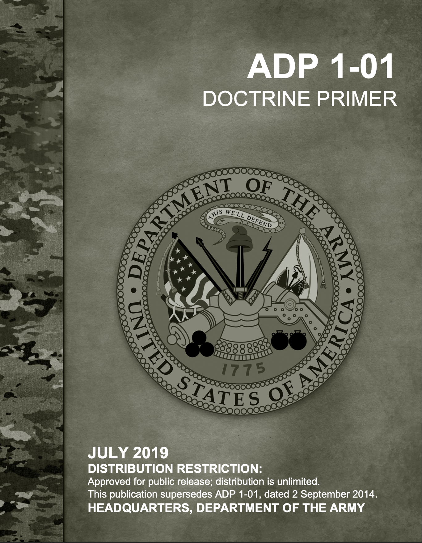 ADP 1-01 guides Army professionals (both Soldiers and Department of the Army Civilians) in their understanding of the entire body of professional knowledge and beliefs that shape the art and science of their profession. It addresses what doctrine is, why it is important, and which major ideas underlie it. The publication also discusses the most important taxonomies and terms used in the conduct of operations and the way they fit together as a single coherent whole. The principal audience for the ADP 1-01 is all members of the Army Profession.