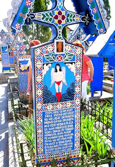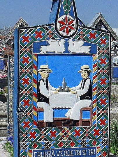 Веселий цвинтар = The Merry Cemetery (Romanian: Cimitirul Vesel) is a cemetery located near a church in the Romanian village of Săpânța, Maramureş county. A feature of the cemetery is the unique colored wooden tombstones, with painting describing scenes from the life of the villagers buried there, often accompanied by witty poems about the dead or the causes of their death. The cemetery began to acquire its current appearance in 1935, when the local artist Ioan Petrash first performed a "cheerful" epitaph. Currently, the cemetery has about 800 tombstones and is one of the most popular tourist destinations in Romania.