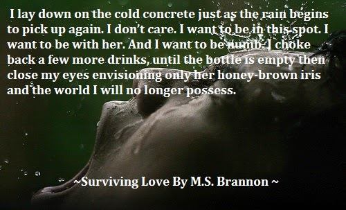 Love the way Brannon tells a story. Once I started reading Surviving Love I could not put it down. It was a heart wrenching emotional roller coaster from the very first word. It takes off diving back into Drake's loss head on and Brannon holds nothing back as she hooks her claws in you. She gives a little bit of closure and leaves so much room for the next installment in the series. I can't wait for Jeremy's story. M.S. BRANNON ROCKS!