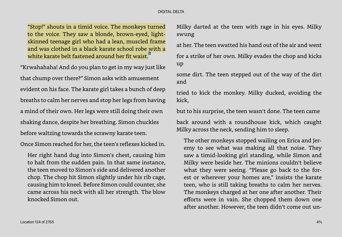 “Hey! Over here! I won't let you continue doing injustice!” rang out from the determined Gina, who transformed. As Gina's data rose, Mobius smirked before snatching Thema in a sudden fashion and hurling her at Gina. As Thema was coming in hot, Pink shot up and darted in the direction of the flung Thema. At the same time, Mobius lunges at Gina. Gina was shocked by the sudden action. However, Gina leaps over Thema and Pink. As she was in midair, Mobius attempted to strike her down. Mobius' heavy fist of dark data came down on Gina. To Mobius's surprise, Gina lunged with the intent to do massive damage, despite how close Pink and Thema were. Gina's crackling roundhouse kick met Mobius's heavy fist. On initial contact, sparks of dangerous data spring forth like a fountain. Before hitting the ground or being struck by the destructive data Gina and Mobius were releasing, Thema rolls and snatches Pink. After allowing the skateboard to take most of the impact, Thema rolled to one knee and raised her skateboard to shield her and Pink, whom she had by the collar. Gina and Mobius's data crackled and popped as they stood in a deadlock. Neither of them wanted to give an inch. Thema watched in awe as the two struggled furiously. In a moment, Gina and Mobius were forced apart by the extreme buildup of data. To Thema's surprise,One more passage to illustrate all of this: