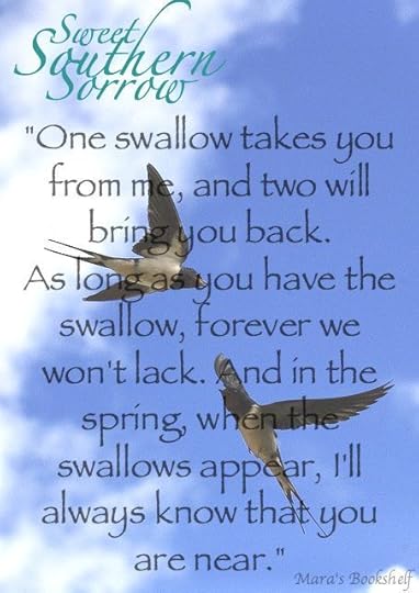 “One swallow takes you from me, and two will bring you back. As long as you have the swallow, forever we won’t lack. And in the spring, when swallows appear, I’ll always know that you are near.”