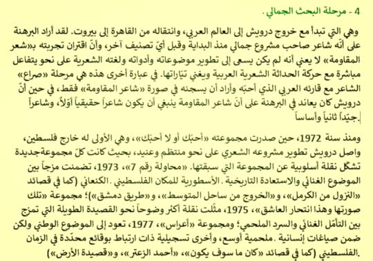كانت ومازالت أجمل دواوين درويش التي تجدها تتراقص وتتقافز من الكلمات بموسيقاها العذبة، ومن الطبيعي أن يتناول القضية الفلسطينية وليس هذا موضع تقييم فتلك قضيتنا كلنا ناهيك عن كونه فلسطيني وكانت القضية الفلسطينية جزء من هويته. لهذا يعجبني في هذه المرحلة المستمرة من كل حياته (عناده) في القصيدة...