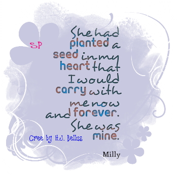 Cree oh amazing, swoon worthy Cree…What can I say? I loved him. He was always such a gentleman to Milly, He is a great father to Annie, hard-worker...the list could go on forever. They definitely belong together.. While I love Milly and Cree, my favorite characters to read were Milly and Annie. The relationship that they develops is like no other. Annie is what helps MIlly grow alot throughout the book.