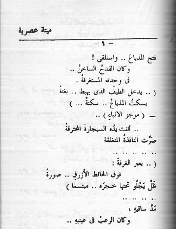 أيتها الحمامةُ التَّعبى: دُوري على قِبابِ هذه المدينةِ الحزينهْ وأنشِدي للموتِ فيها.. والأسى.. والذُّعرْ حتى نرى عندَ قُدومِ الفجرْ جناحَكِ المُلقى.. على قاعدةِ التّمثالِ في المدينهْ وتعرفين راحةَ السَّكينهْ!