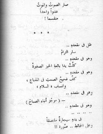 كلَّ صَباح.. أفتحُ الصنبورَ في إرهاقْ مُغتسِلاً في مائِه الرقْراقْ فيسقُطُ الماءُ على يدي.. دَمَا! وعِندما.. أجلسُ للطّعام.. مُرغما: أبصرُ في دوائِر الأطباقْ جماجِماً.. جماجِماً.. مفغورةَ الأفواهِ والأَحداقْ!! _______________________________________