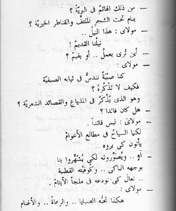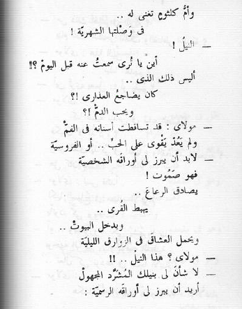 - النيلُ ! أين يا تُرى سمعتُ عنه قبل اليومْ؟! أليس ذلك الذي .. كان يضاجعُ العذارى!؟ ويحب الدمّْ!؟ - مولاي: قد تساقطت أسنانه في الفمّْ ولم يَعُدْ يقْوى على الحبِّ .. أو الفروسيّة - لا بدّ أن يبرز لي أوراقه الشخصية فهو صَمُوت! يصادق الرعاعَ .. يهبط القرى .. ويدخل البيوتْ .. ويحمل العشاقَ في الزوارق الليلية - مولاي؟ هذا النيلْ ..!! - لا شأنَ لي بنيلك المُشَرَّد المجهولْ أريد أن يبرز لي أوراقه الرسميّة: شهادة الميلاد .. والتطعيمِ .. والتأجيلْ والموطن الأصليِّ .. والجنسيّة حتى يمارسَ الحريَّة! .. ويلْقي المعلمُ مقطوعةَ الدرسِ، في نصف ساعة: (ستبقى السنابلْ .. وتبقى البلابلْ .. تغرِّد في أرضنا .. في وداعهْ ..) ويكتب كلُّ الصغار بصدق وطاعهْ: ( ستبقى القنابلْ .. وتبقى الرسائلْ .. نُبلِّغها أهلنا .. في بريد الإذاعهْ _______________________________________