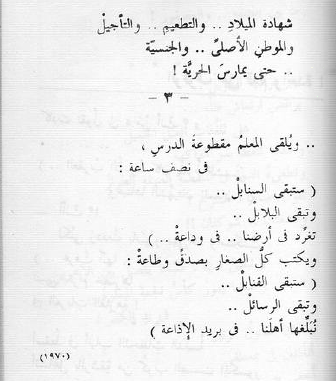 فالعلم الذى تنكسينه.. على سرادق العزاء منكس فى الشاطئ الآخر، والأبناء.. يستشهدون كى يقيموه.. على "تبة"، العلم المنسوج من حلاوة النصر ومن مرارة النكبة خيطاً من الحب.. وخيطين من الدماء العلم المنسوج من خيام اللاجئين للعراء ومن مناديل وداع الأمهات للجنود: فى الشاطئ الآخر.. ملقى فى الثرى ينهش فيه الدود، ينهش فيه الدود.. واليهود فانخلعى من قلبك المفئود