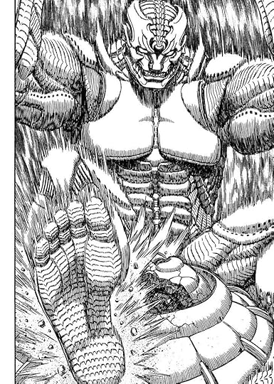 Then there's the battles, worthy of standing next to Godzilla's with head held high. Entire chapters are dedicated to one-on-one fights, detailing each maneuver, each strike and the thoughts behind them. Western comics would have wrapped things up in a few pages, but here the battles are drawn out and explored in all their grotesque beauty.