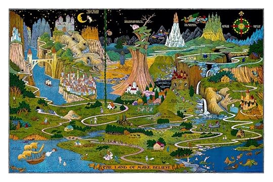 I reached out to the publisher to get this book early because it caught my eye as being "my thing". And it was but I've been reading so many short stories lately which had me craving a good novel. Without that trouble, I really did like this book. This is a compilation of revamped fairy tales and folklore, each one brought to the modern day (or almost all of them). Most of the stories don't have that "happy ending" and are steeped in actual tragedy within the world we live in. I really liked that realistic take on those magical stories we've grown up on. The introduction to the stories talks a little about the strong connection the Author has to these tales and how she wanted to do something a little different with them. She also introduces her "kid" self sitting in the dentists chair gobbling up a fairy tale painting with her eyes. Thompson explains that this beautiful print was called "The Land of Make Believe", it beheld a map of all the magical creatures and places any kid would want to visit or befriend. The original painting was done by Jaro Hess and can still be found to this day. I think it would make a wonderful "deluxe" edition to this book of stories and can only hope the Author and publisher think so too. Here is the map: