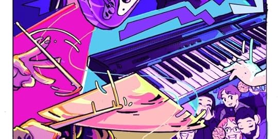 logo, tamén necesito salientar a arte deste libro. AMEINA. xa non só polo estilo medio anime cuqui bonitiño e todo iso, é que as cores e a composición (por chamalo dalgunha forma) son marabillosas. adoro como está coloreado todo, o xogo entre o rosa e o violeta como as cores características de Vega e Ámbar respectivamente. en relación á "composición", o que quero dicir é que se sinte como se as viñetas fosen líquidas. constantemente rómpese o cadrado típico para ir concorde ás emocións que amosan o personaxe visible. outro exemplo no que se ve isto é na expresión de movemento. as liñas saen do propio obxecto en movemento e están coloreadas. aquí podedes ver un exemplo do segundo que menciono. fixádevos na batería e na man no teclado. é como se todo estivese feito dunha masa viscosa e unha parte deles quedase aí despois do movemento. non sei como explicalo, pero en conxunto fan que a banda deseñada rebose expresividade e adoro iso.