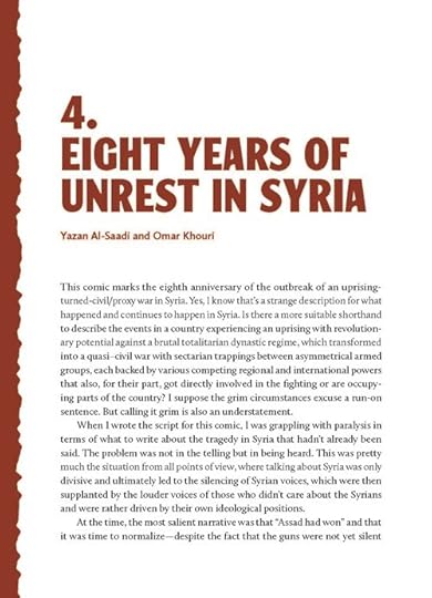 I know the this is presented in a graphic media form, and that form lends itself to less granular detail, which is what would have made it more interesting for me), but perhaps the author could make a series of books with one extended story each and really tell the stories of what is happening in the region. That would help me became more motivated to be more active at least emotionally. Narratives have a wonderful way to activate people's intelligence and emotions. I find the narratives in these stories thread bare.
