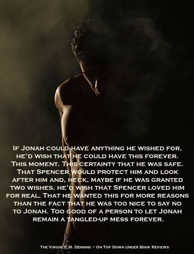 Jonah does eventually come to realize that the reason he couldn't ever go all the way with another man was because he's demisexual, which I think I had figured out from very early on in the book. He had to have trust and an emotional connection, something he'd not even come close to having with the other guys he'd attempted to hook up with in the past.