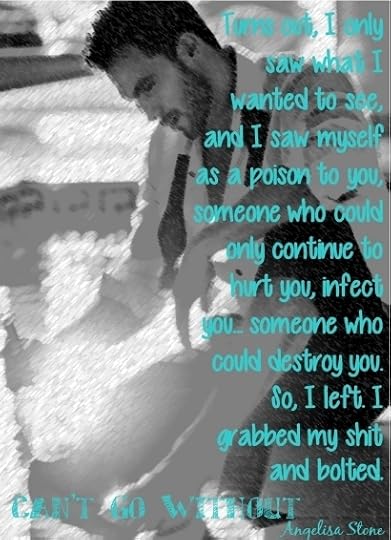 Maybe I should start over. This is my review of Can't Go Without book two in the Oasis Waterfall series by Angelisa Stone. Book one was Can't Go Home. Another really good story and book one in the series. I thought it would be my favorite buy nope. Tristan has won over my heart. Angelisa has won over my brain. She's such a good story teller. Such a good writer. You start reading and before you know it the story is done. Her writing is so real to me. So normal and down to earth. She doesn't really sugar coat anything. She doesn't trick you into thinking that love is all rainbows and unicorns. She writes stories that are believable. Well...believable in that the people in her stories act like real people.