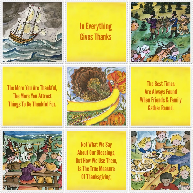 Nice illustrations and informative text. Thanksgiving didn't orignate with pilgrims and Indians; it traces it's roots all the way back to Eygptian days with the god Min. Egyptians gave thanks to the ferility god Min after a good harvest. The Chinese celebrate Moon day and make cakes on the full moon, giving thanks with the harvest moon. I was surprised to learn that Canada celebrates the holiday in October.