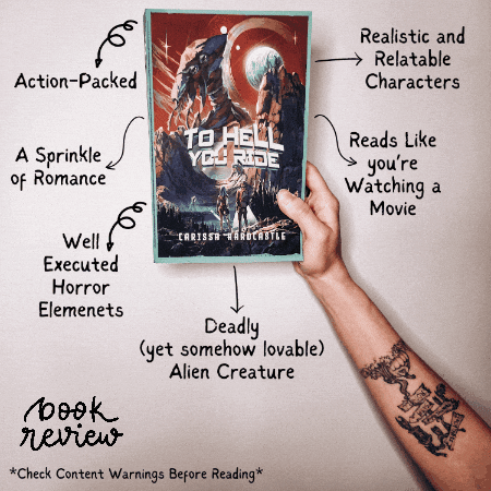 So, this is not my usual read and let me tell you I’m so glad I applied for this ARC. To Hell You Ride is like a fantastic 90s/00s sci-fi action flick. It has all the good stuff with the small-town vibes, secret squirrel government agency, creepy monster aliens, and fun banter between a scientist and military veteran. I can see it playing out before my eyes and I want to watch it again and again.
