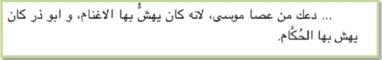 ♪ أَعلم أنه لا ينظف الرمال إلا الرمال، ولكن اِعلم أنت؛ لا ينظف العصا إلا أبو ذر. ... دعك من عصا موسى، لأنه كان يهش بها الأغنام، وأبو ذر كان يهش بها الحكام. أضاف موسى باهتمام!؛ ولي فيها مآرب أخرى، لقد كان أيضا يتوكأ عليها.. لا بأس. ... هنا مخدة الفلسفة. تعال اسمع صخور الربذة كيف عانقت جندب بن جنادة، وتعال اسمع ابنة شعيب كيف عانقت موسى بن عمران.. تعال اسأل الأرض كيف مات بمنفاه ثائر الفقراء، وتعال اسأل الأرص كيف مات موسى مع آخر حساء. ...آه، هل سيزعل موسى مني كثيرا؟. ربما، ولكنه سيحب الربذة أكثر.