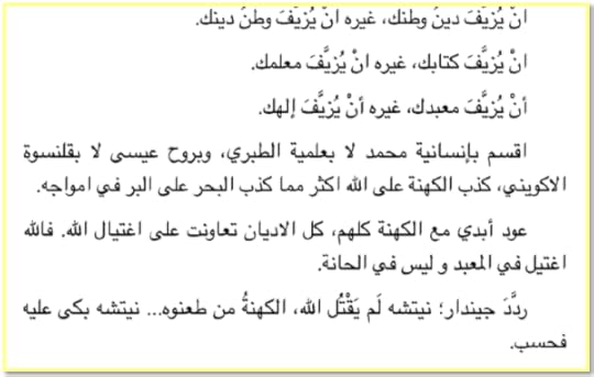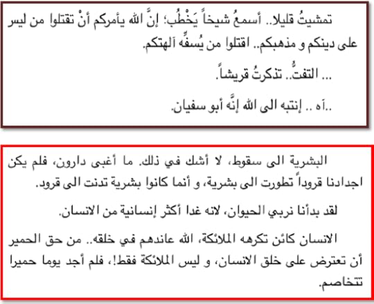 “يريدون الله قاتلا !. لا يبقى حينها هو الله . ..انتبه الى الدماء انها ماء، انتبه الى المعبد انه حانه تمشيت قليلا .. اسمع شيخا يخطب ؛ إن الله يأمركم ان تقتلوا من ليس على دينكم و مذهبكم .. اقتلوا من يسفه آلهتكم ... التفت .. تذكرت قريشا. .. اه .. إنتبه الى الله إنه ابو سفيان”