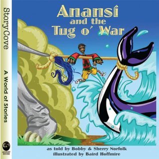 Anansi is a spider and one day an elephant didn't see him and lay on him. Anansi challenged the elephant to a tug-of-war, but while the elephant napped, Anansi tied a rope to him and ran to engage a killer whale in the same challenge. When they pulled against the rope, they thought they were in competition with the spider and couldn't believe how strong he was. Cute story.