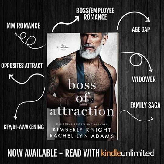 Boss of Attraction is book three in the Forbidden series by Kimberly Knight and Rachel Lyn Adams. This is a forbidden, boss/employee, age gap, MM romance that I really enjoyed. I want to admit up front that big age gaps isn’t usually my thing, but for some reason, I didn’t really feel this one like I usually do. These two really did seem like they were meant for each other.