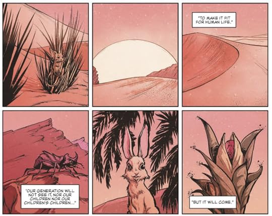 The art has a retro vibe to it, but the compositions are modern and playful. I'm not the biggest fan of the colouring – they included great variation considering it's all set in the desert, but it all has this very flat vibe to it that makes it feel like it's a Marvel comic from the last century. It's obviously a conscious stylistic choice made and probably in line with being faithful to the novel, but I personally would have found a visually updated version more fun to read. What counters that quite quickly nicely is how experimental the frames are, so there's great variety in that. The fight with Jamis is a highlight. Both the action and the emotional weight of the scene comes across.