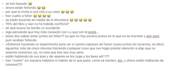 - se han besado 😭 - ahora están follando 😭😭 - por qué la invita a una cita a su casa 😭😭😭 - han vuelto a follar 😭😭😭😭 - se están tocando en medio de la discoteca 😭😭😭😭😭 - 70% del libro y aún no ha habido conflicto? - ah qué bueno ha tenido un accidente - sigo pensando que hay más conexión con Lu que con la prota… - estos dos saben estar juntos sin follar?? es que no hay escena juntos en la que no se morreen y pim pam pum acaben follando. - «Estamos haciendo un experimento para ver si somos capaces de hacer cosas juntos sin tocarnos, es decir, aguantar más de cinco minutos haciendo cualquier cosa que nos haga prestar atención a algo que no seamos nosotros» ya, no creo que eso sea muy sano. - están hablando de sus pies y de repente se los coge y los besa wtf ??? - han “vuelto” sin siquiera hablarlo ni hablar de lo que pasó, como se sienten, etc, y ahora están hablando de casarse?!?! (copio y pego también que en la versión móvil no sale la foto).