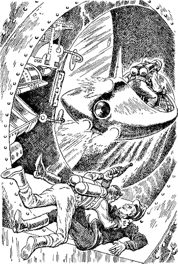 Opening: What was the mystery of this great ship from the dark, deep reaches of space? For, within its death-filled chambers—was the avenue of life! JOHN SABO, second in command, sat bolt upright in his bunk, blinking wide-eyed at the darkness. The alarm was screaming through the Satellite Station, its harsh, nerve-jarring clang echoing and re-echoing down the metal corridors, penetrating every nook and crevice and cubicle of the lonely outpost, screaming incredibly through the dark sleeping period. Sabo shook the sleep from his eyes, and then a panic of fear burst into his mind. The alarm!