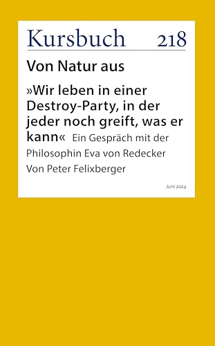 Um die Spannung zwischen dem Natürlichen und seiner (kulturellen, sozialen, historischen, praktischen, wissenschaftlichen, nachahmenden etc.) Darstellung und Darstellbarkeit kreisen die Beiträge dieses Kursbuchs »Von Natur aus«. Eva von Redecker spricht von notwendiger Regenerationsarbeit, die wir mit dem Stoffwechsel der Natur betreiben müssen.
